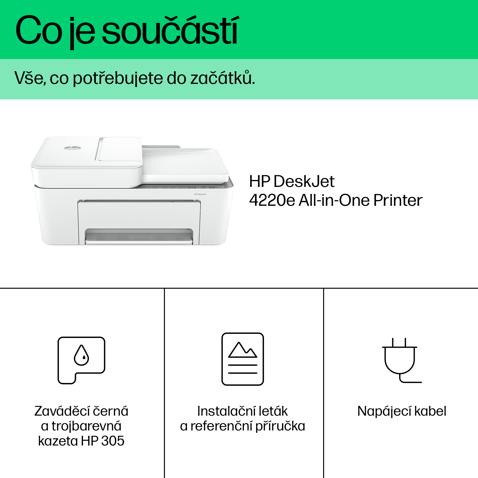 | Obsah krabice | HP DeskJet 4220e All-in-One Printer; HP 305 Setup Black Cartridge (~120 pages yield); HP 305 Setup Tri-Color Cartridge (~100 pages yield); Regulatory flyer; Setup guide; Reference guide; Power cord [For ink volume and page yield information, visit http://hp.com/go/learnaboutsupplies] |