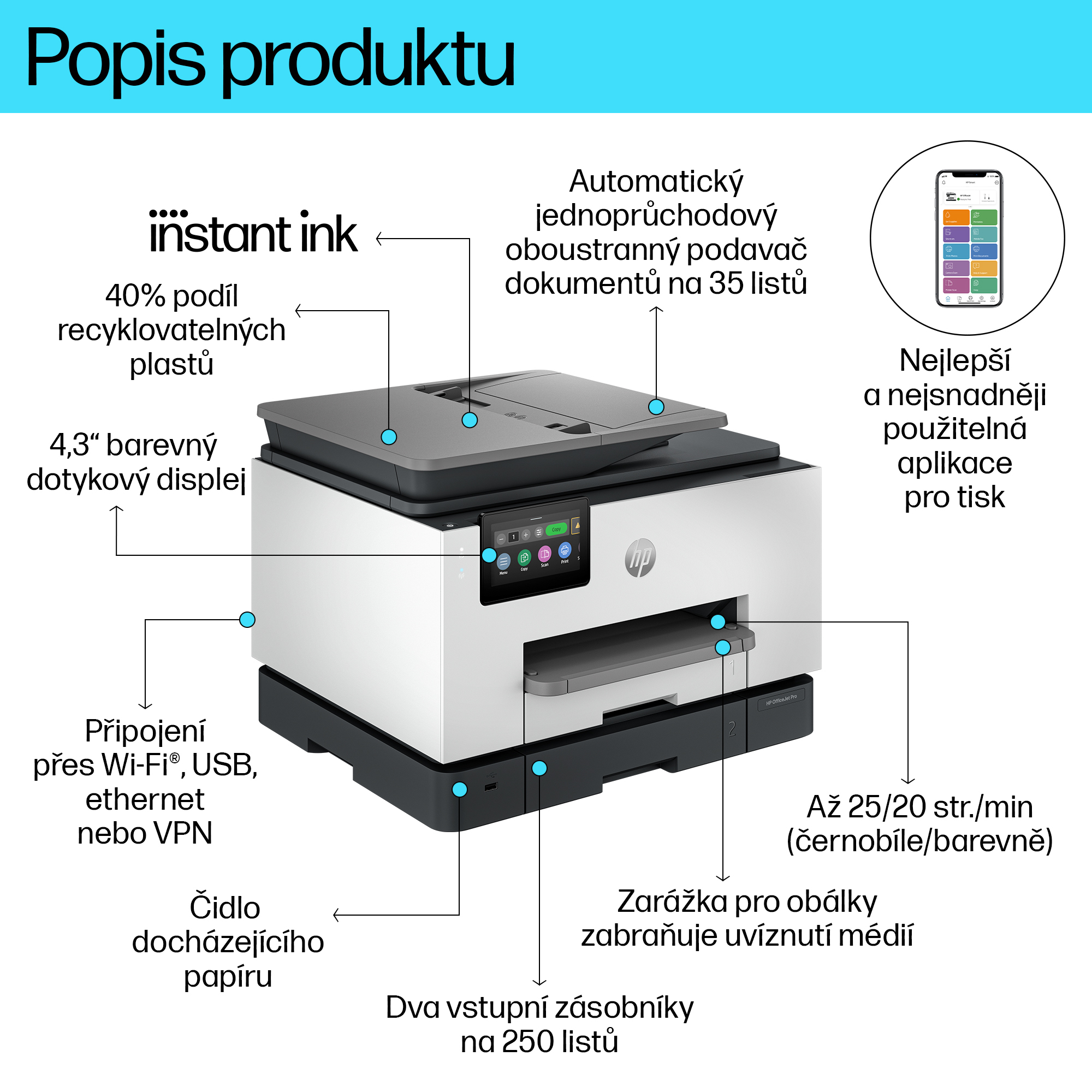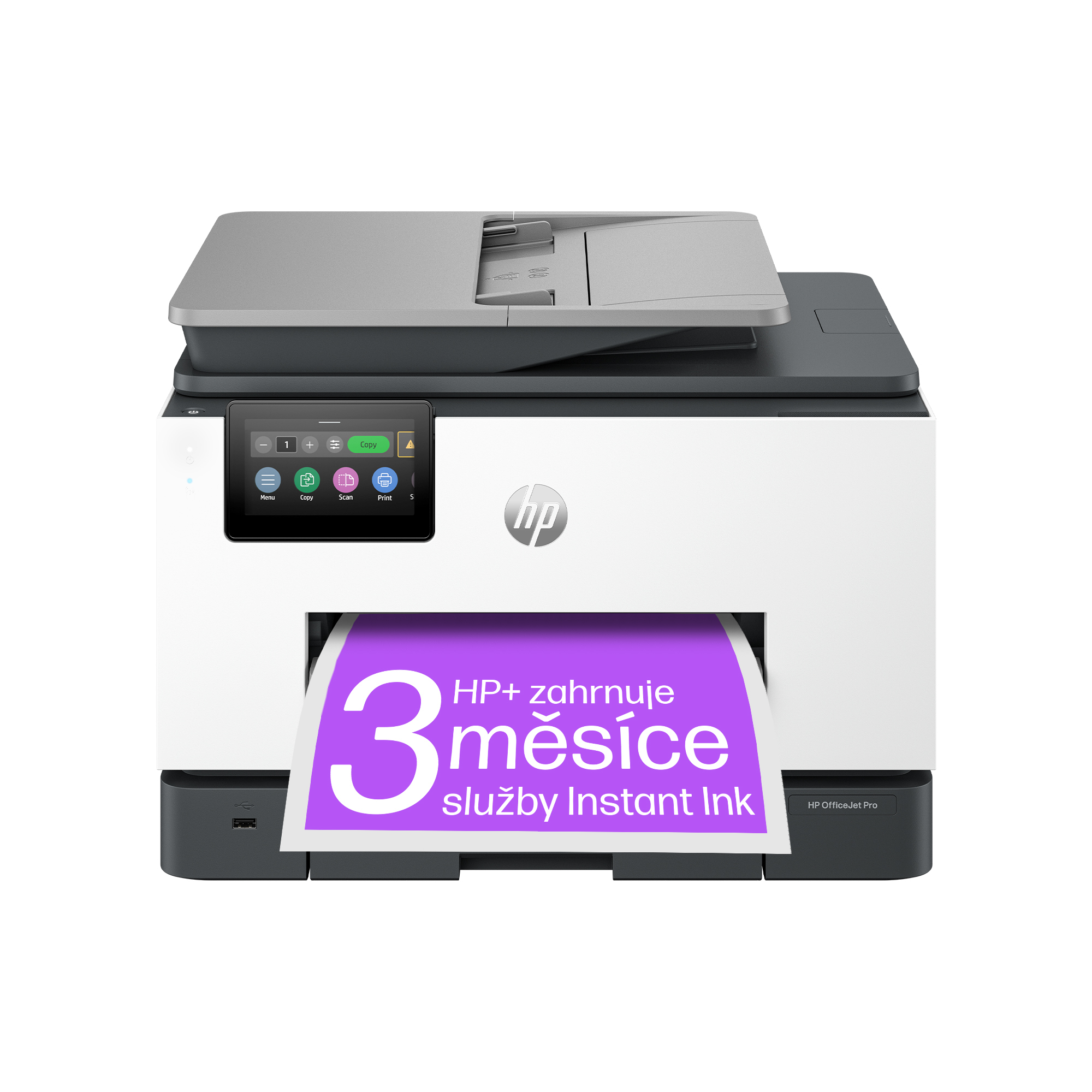 Toto je tiskárna s podporou služby HP+. Vyberte si při nastavení produktu službu HP+ a získáte výhody. Služba HP+ vyžaduje účet HP, nepřetržité internetové připojení a výhradní použití originálních inkoustových kazet HP po celou dobu životnosti tiskárny. Další informace jsou k dispozici na adrese: http://www.hp.com/plus