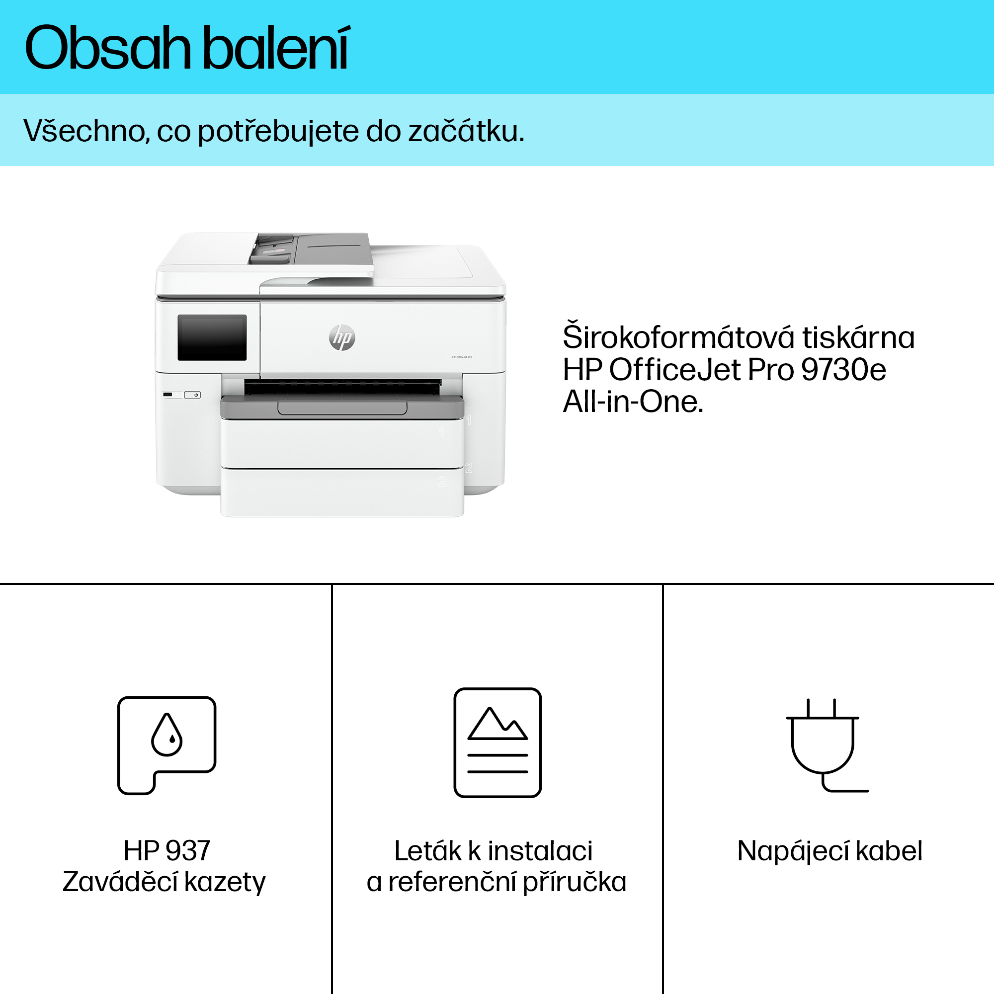| Obsah krabice | Širokoformátová tiskárna HP OfficeJet Pro 9730e All-in-One; Černá zaváděcí inkoustová kazeta HP 937; Azurová zaváděcí inkoustová kazeta HP 937; Purpurová zaváděcí inkoustová kazeta HP 937; Žlutá zaváděcí inkoustová kazeta HP 937; Regulační leták; Leták s upozorněním na inkoust; Napájecí kabel; Instalační leták; Referenční příručka; [další informace o plnění a výtěžnosti jsou k dispozici na http://www.hp.com/go/learnaboutsupplies] |
